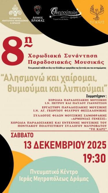 Συνάντηση Παραδοσιακής Μουσικής στην όμορφη Δράμα με τίτλο: " Αλησμονώ και χαίρομαι, θυμιούμαι και λυπιούμαι". Μια μουσική συνάντηση αφιερωμένη στα τραγούδια της ξενιτιάς και του ανταμώματος. Μια ακόμα μουσική εμπειρία ανάμεσα σε μουσικές ομάδες και ανθρώπους που μοιράζονται την ίδια αγάπη για τον λαϊκό μας πολιτισμό μέσα από τον οποίο, οι ήχοι με τα νοήματά τους περνούν στις νέες γενιές, και η κοινωνία έχει την ευκαιρία να ξαναζεί τα τραγούδια και τις ιστορίες τους, κρατώντας ζωντανή τη συλλογική μνήμη και την παράδοση.