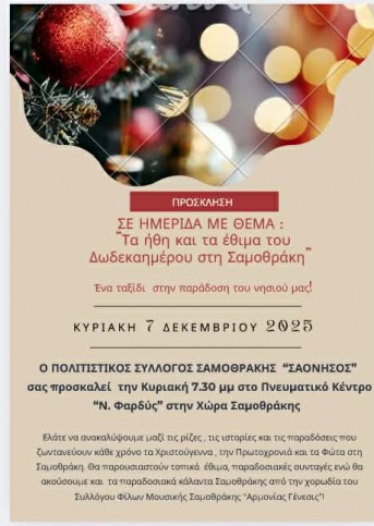 Το Σάββατο 21 Δεκεμβρίου πραγματοποιήθηκε η χριστουγεννιάτικη εκδήλωση του Συλλόγου Φίλων Μουσικής Σαμοθράκης «Αρμονίας Γένεσης», ενώ είχε προηγηθεί η συμμετοχή της χορωδίας με τα κάλαντα στο άναμα του χριστουγεννιάτικου δέντρου του Δήμου στην Καμαριώτισσα στις 19/12. Μικροί και μεγάλοι, μέσα από τα φωνητικά και μουσικά σύνολα, παρουσίασαν χριστουγεννιάτικα τραγούδια και κάλαντα ταξιδεύοντας μας σε κάθε γωνιά της Ελλάδας, μεταφέροντας το πνεύμα, την παράδοση και τα μηνύματα των Χριστουγέννων.