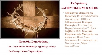 Την Κυριακή 14 Απριλίου τα Χορωδιακά Σύνολα του συλλόγου Φίλων Μουσικής Σαμοθράκης 'Αρμονίας Γένεσις" παρουσίασαν μια συναυλία -αφιέρωμα στον μεγάλο Έλληνα Μουσουργό Μίκη Θεοδωράκη, ένα από τους θεμελιωτές του νεότερου πολιτισμού μας, που κατάφερε μέσα από τη μουσική και τα τραγούδια του να φέρει στο στόμα και στην καρδιά χιλιάδων ανθρώπων τα λόγια του Ελύτη, του Σεφέρη, του Ρίτσου, του Αναγνωστάκη και τόσων άλλων σπουδαίων ποιητών.